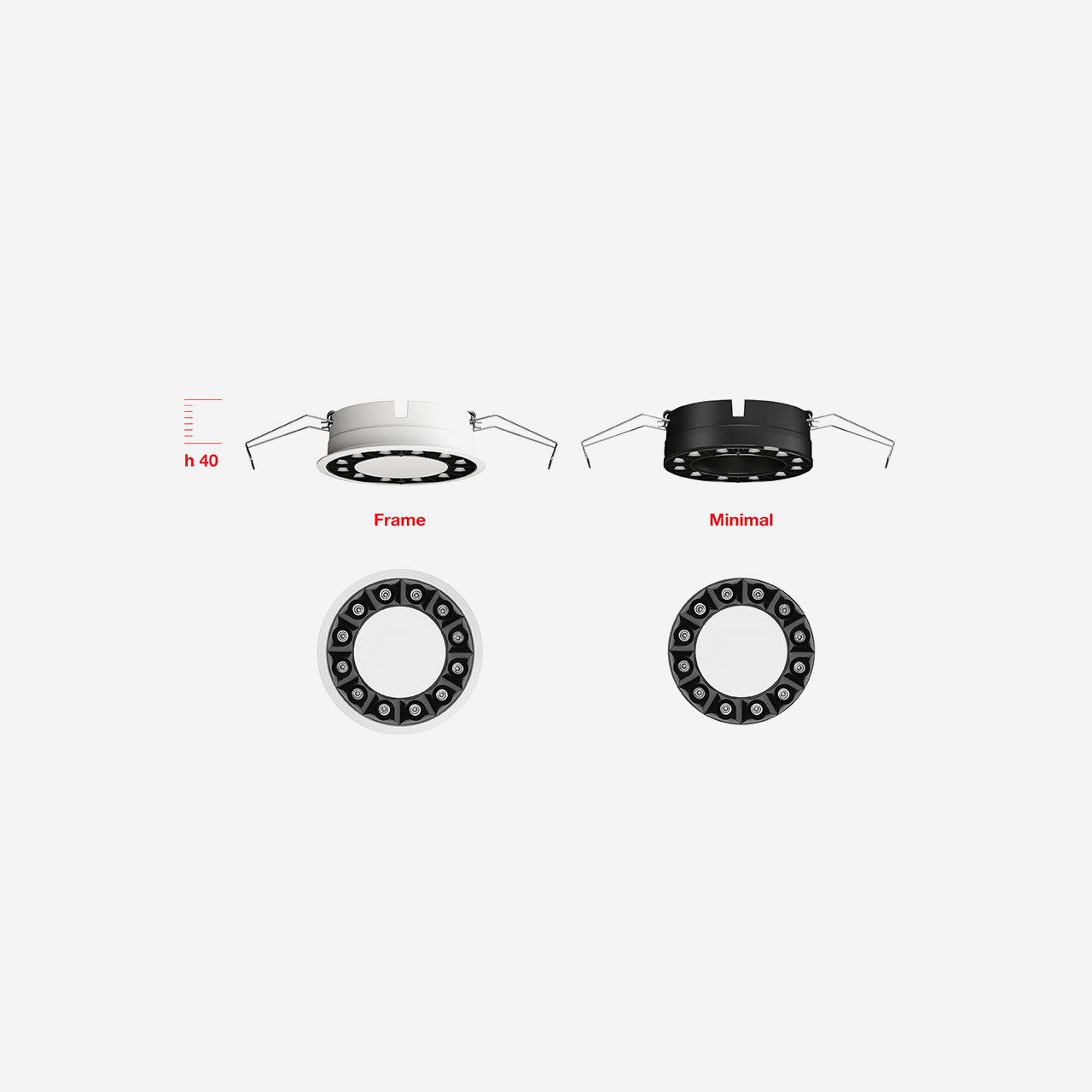 - Installazione ad incasso su controsoffitti di spessore da 12,5 a 25 mm per versioni Minimal (senza falda perimetrale) o da 1 a 25 mm per versioni Frame (con falda) tramite molle di torsione.
