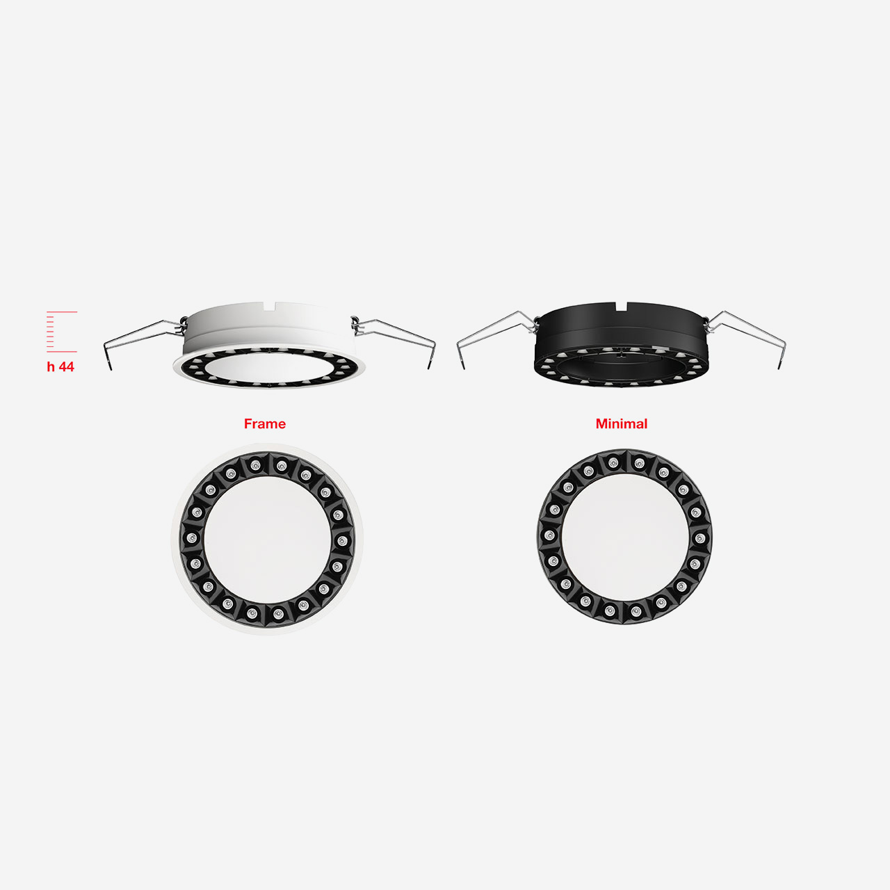 - Installazione ad incasso su controsoffitti di spessore da 12,5 a 25 mm per versioni Minimal (senza falda perimetrale) o da 1 a 25 mm per versioni Frame (con falda) tramite molle di torsione.