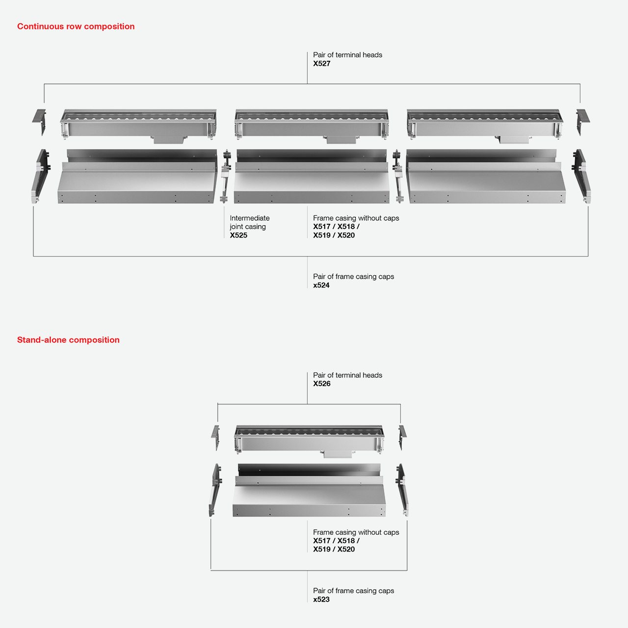 - Apparecchio di illuminazione ad incasso a pavimento, parete e soffitto finalizzato all’impiego di sorgenti luminose LED monocromatici, RGBW e Tunable White con sistema di controllo DALI, DMX-RDM e alimentatore integrato 220÷240Vac.