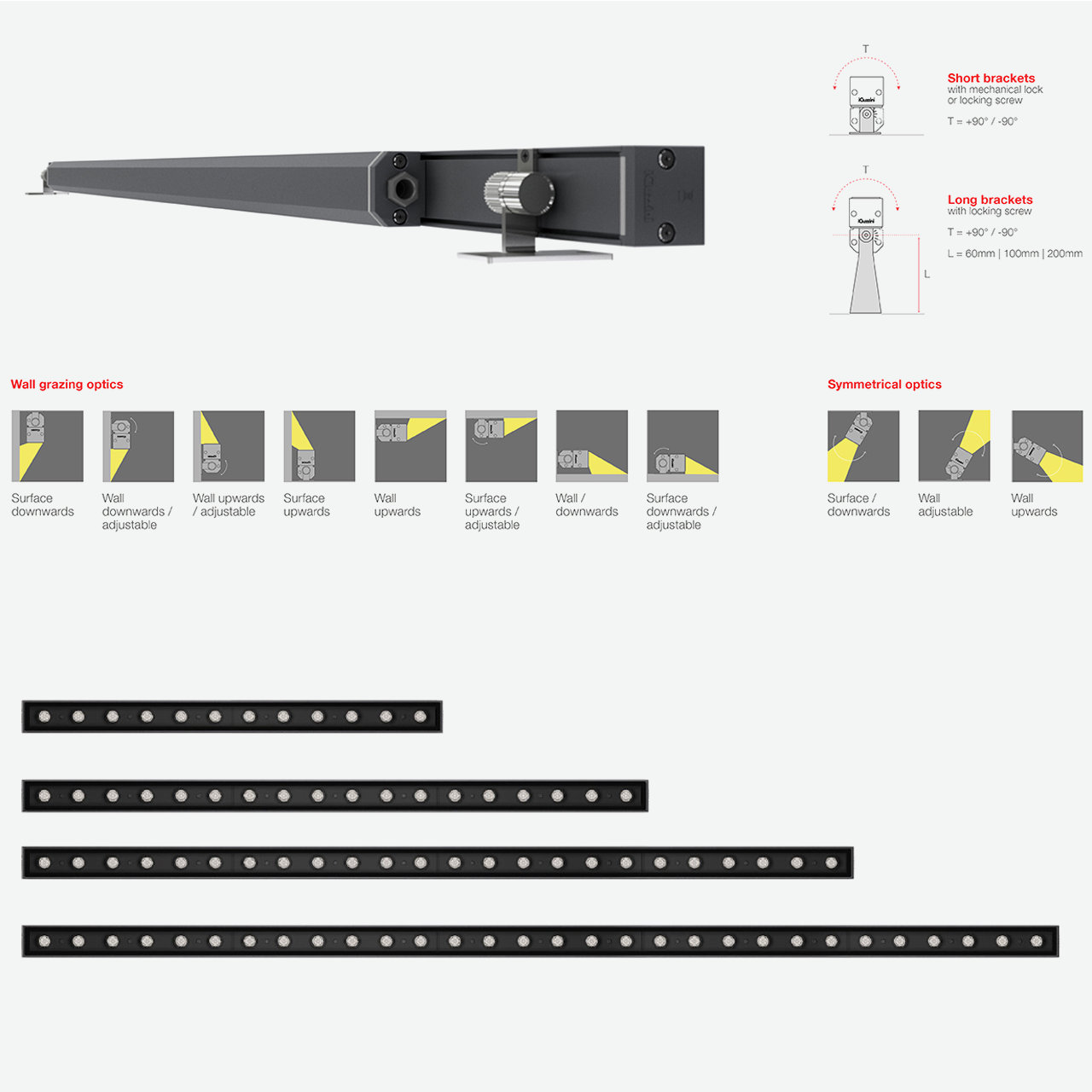 - Ottiche per distribuzione luminose di tipo wall-grazing Spot (WGS), Wall grazing Medium (WGM), Wall grazifing WF (Wide Flood).