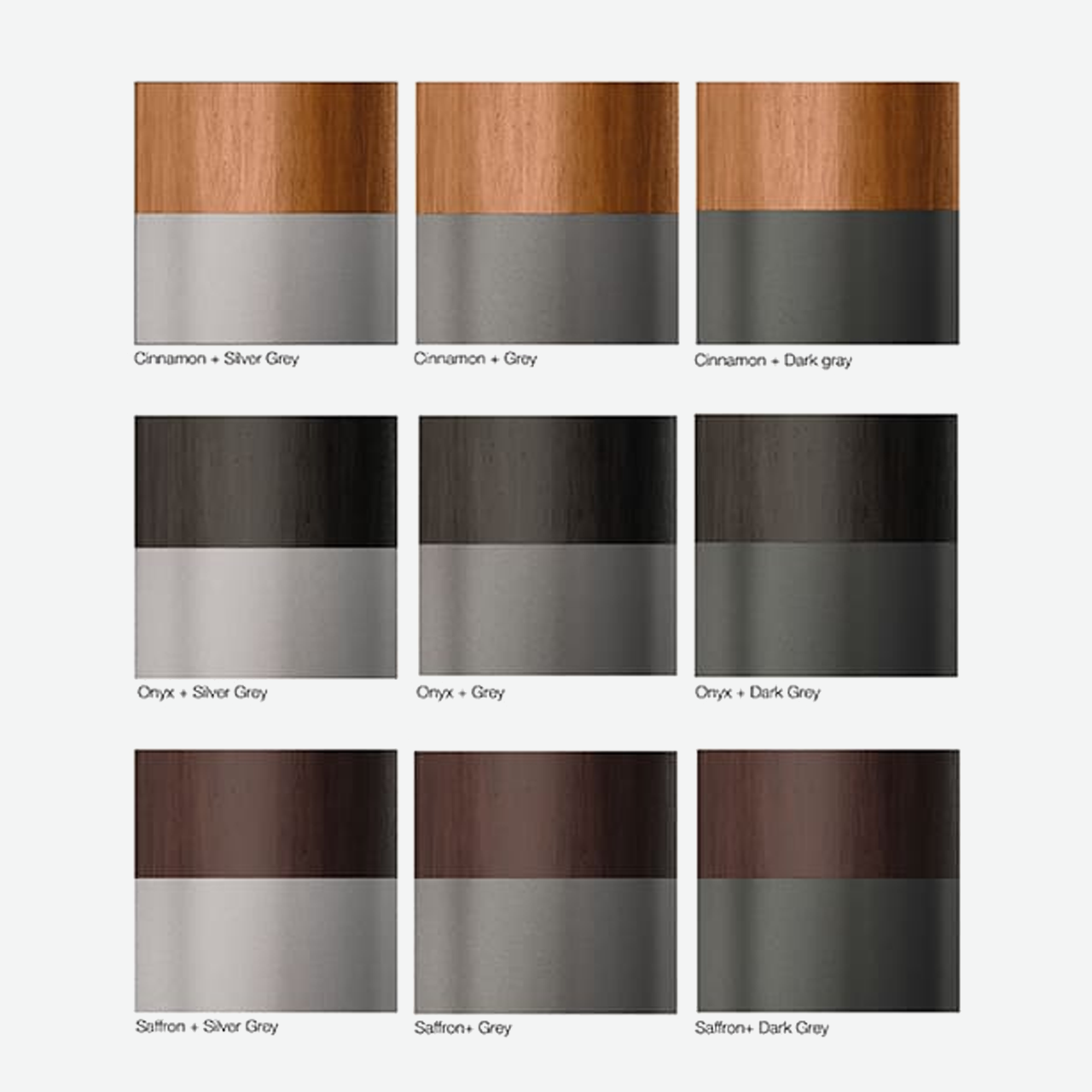 - Sono disponibili 9 finiture: combinazione di 3 finiture di legno (cannella, zafferano e onice) e 3 finiture dell’acciaio (grigio grafite, grigio argentato e grigio sabbia).