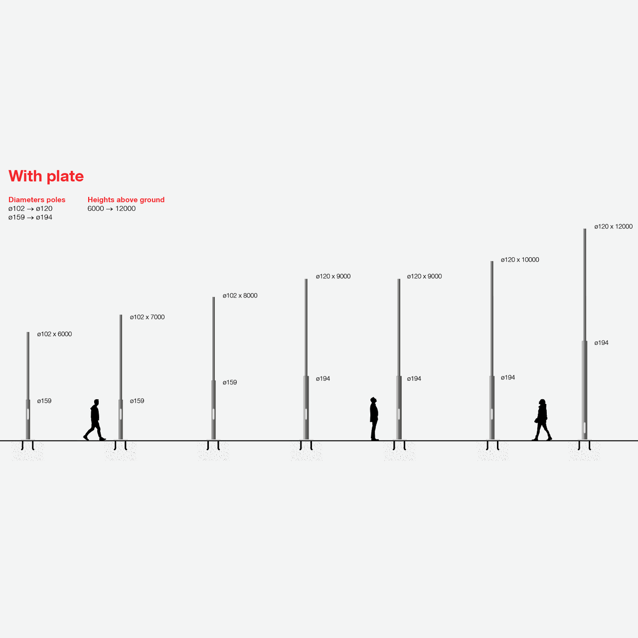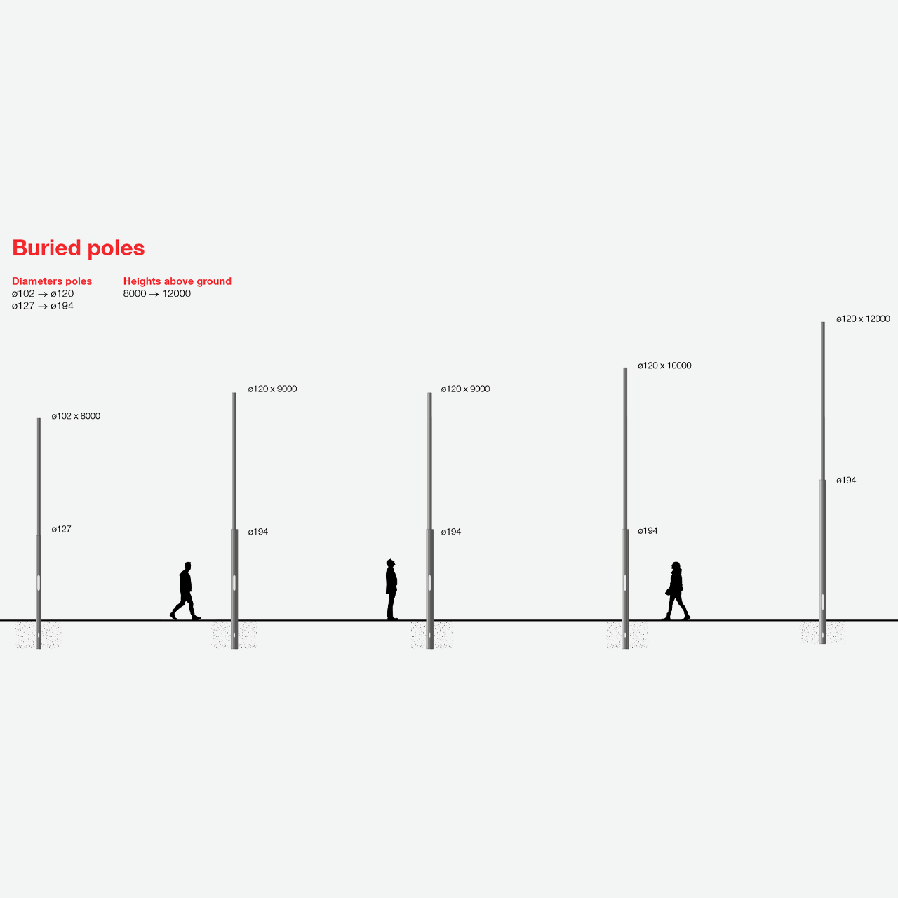 - Nella parte superiore dei pali (cod. 1544-1545-1546-1547- 1548-1552-1554-1561-1562- 1565-1597-1598-1599) sono presenti sei fori passanti ed inserti filettati in acciaio inox, per consentire il fissaggio del braccio con tirante (per i Sistemi Lavinia e Cut-Off).
